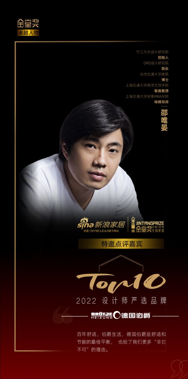 近些年来,在消费升级的大背景下,用户决策力影响因素在逐步增加,设计师也在衣食住行等各行业消费中承担着引导作用。为推动行业良性发展,严选高端设计品牌,新浪家居联合金堂奖重磅推出「2022 设计师严选品牌 TOP10」活动,以行业创新发展为基础,以专业设计师角度为准则,最终形成客观、真实的「2022 设计师严选品牌 TOP10」榜单。