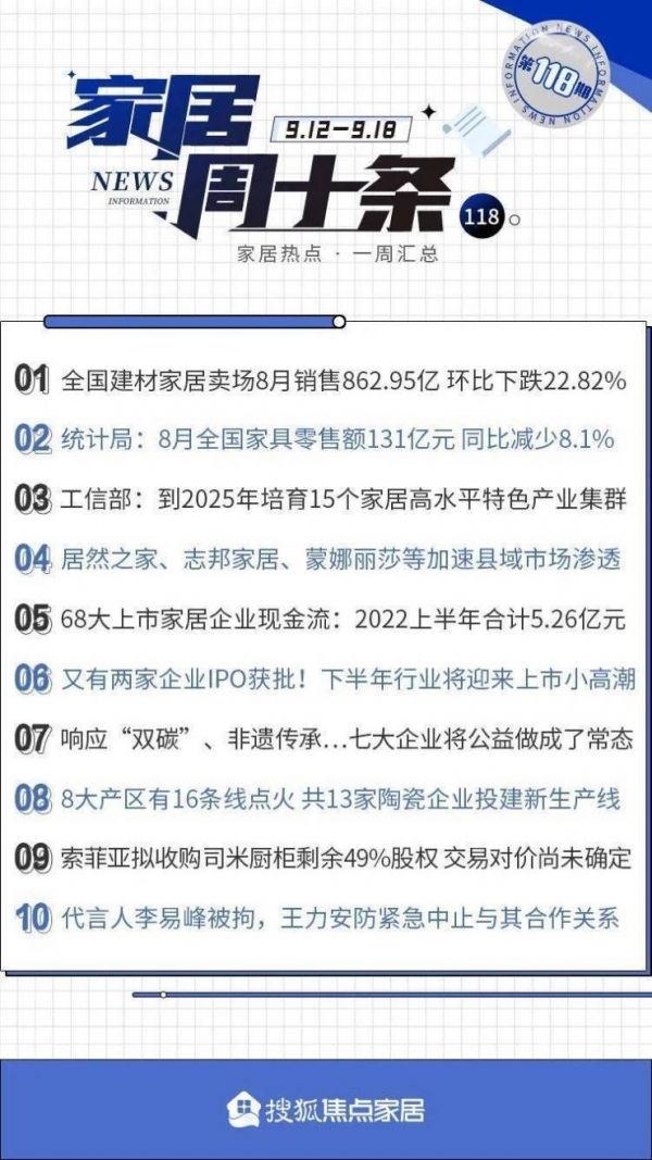 家居周十条丨全国卖场8月销售降至862.95亿元、31家企业现金流为负…