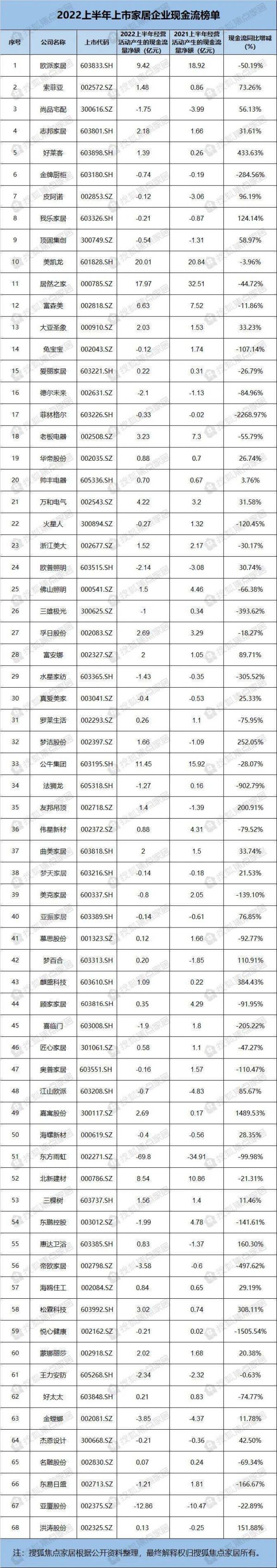 截止到2022年6月30日,据搜狐焦点家居不完全统计,68家上市企业中,共有31家经营活动产生的现金流量净额为负,占比约为45.59%。