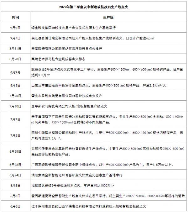 2022年第三季度,广东、江西、福建、山东、广西、四川、重庆、山西等产区陶企都有新动向。一些陶企通过对原有的生产线进行技术升级,或引进全新的生产线,调整自身产能结构,以适应市场的变化。