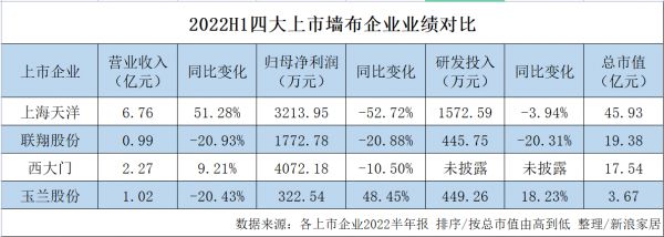 那么2022年上半年,4家上市墙布企业整体表现如何?下面我们一起来看看。
