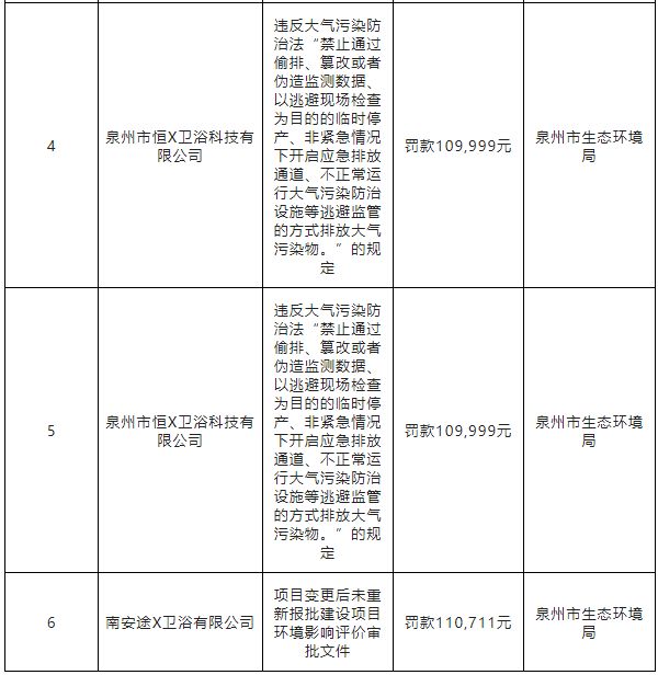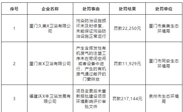 据福建多地生态环境部门通报,7-9月共有6家卫浴企业因环境违法被行政处罚并通报,其中泉州4家、厦门2家。在被行政处罚的企业中,一家因项目变更后未重新报批建设项目环境影响评价审批文件,被罚款217144元。