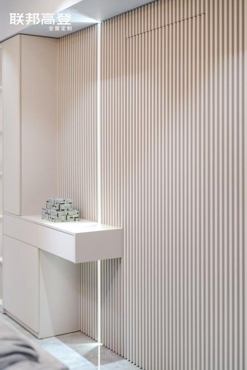 艺术感十足的格栅护墙板、室内门和谐兼容,凹凸有致间彰显温润感,精密裁切工艺下,与灯带装饰浑然天成,格调满满,为家居空间增添别样风情。
