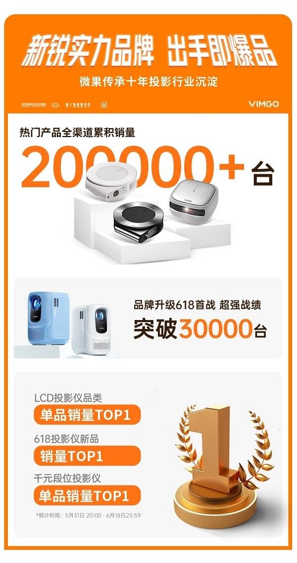 2022年,微果投影完成了全新品牌升级,推出首款产品微果C1智能投影仪,凭借550ANSI超高亮度,真1080P分辨率的细腻超清画面表现,无感自动对焦、无感六向自动梯校的便捷智能体验,内置Luna OS旗舰级智能系统,拥有海量内容资源,以及创新的边锋主义外观设计,微果C1上市即成618爆款,开售18天,全渠道销量突破30000台,斩获LCD投影仪品类天猫京东双平台单品销量第一 、618投影仪新品天猫京东双平台销量第一、千元价位段投影仪天猫京东双平台单品销量第一的佳绩。此后,微果更是开创千元投影新技术,引领高品质投影进入千元时代。