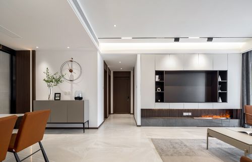 白色的柜体,恰到好处的留白,局部用黑色线条点缀,顶面的线性灯光,追求极致的简约,层次感分明。