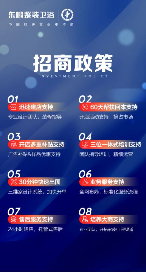 东鹏整装卫浴以八大政策全面助力合作伙伴抢占创富先机,包含迅速建店支持、60天帮扶回本支持、开店多重补贴支持、运营指导支持、三维家案例支持、业务服务支持、售后服务支持、培养大商支持,让您高效运营,实现快速盈利!