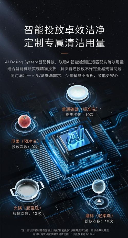 针对投放量,其利用双传感精准投放,根据不同场景智能投放洗碗液,添加一次洗碗液可无忧使用24次,从此告别每日弯腰重复投放,理性释放更多私人时间。