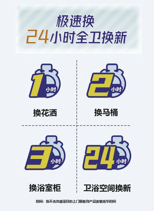 针对以上这些痛点,也让企业发现了升级服务的绝好时机。目前行业中不乏在服务用户上发力的企业,例如,近两年很多企业提出”卫浴空间快速换新“的售后服务,增加很多免费条款,保护消费者权益,提升企业口碑度。同时2小时换马桶,72小时更新卫浴空间,”闪装“、”速装“这类热词也逐渐地出现在大众视野中。