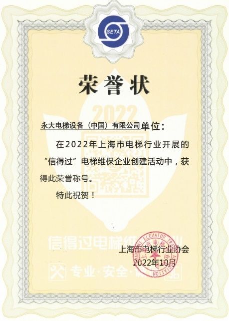 日前,上海市电梯行业协会对外公布了上海市“信得过”电梯维保企业名单,永大电梯蝉联上榜,并获得荣誉授牌,这是对永大电梯维保服务与实力的高度认可。