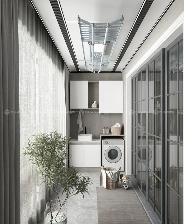 维持原状的话,可以选择定制一个阳台柜,并嵌入洗衣机,作为小型的洗衣房,洗完直接晾晒,动线大大缩短。