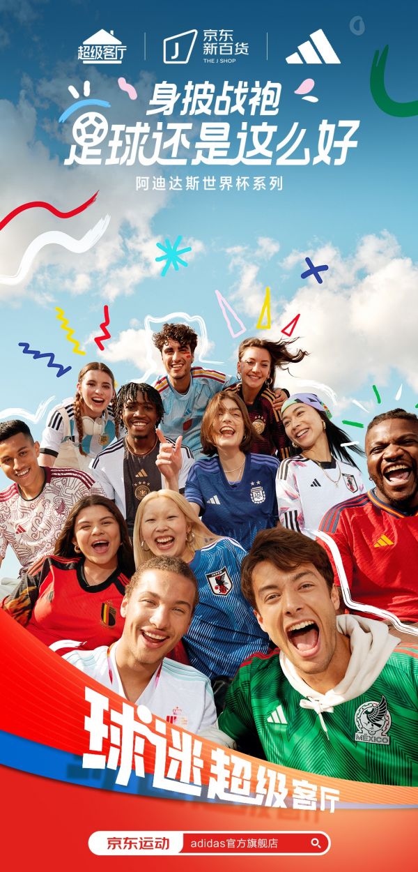 阿迪达斯世界杯系列全新上市,用更好的运动体验为世界杯助威。对球迷来说,无论是看球还是踢球,都少不了阿迪达斯的球衣和球鞋。叫上好友,身穿球衣,为自己喜欢的球队激情助威!才是球迷理想中的客厅!阿迪达斯,以产品赋予“超级客厅”更多可能,延伸球迷的超级体验感。
