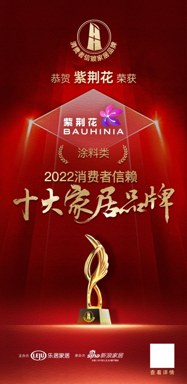 2022年11月1日,历时52天,历经网络票选、专业评审的「2022消费者信赖十大家居品牌」涂料榜单正式揭晓。其中,紫荆花荣登「2022消费者信赖十大家居品牌」涂料榜单!