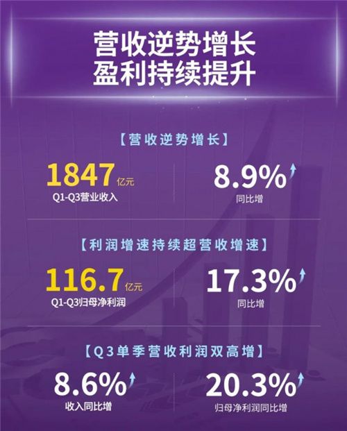 10月30日,海尔智家发布2022年三季报。财报显示,海尔智家前三季度实现营业收入1847亿元,较2021年同期增长8.9%;实现归母净利润116.7亿元,较2021年同期增长17.3%;利润增幅两倍于收入增幅;第三季度单季度收入增长8.6%,归母净利润增长20.3%,单季度表现出很强的经营韧性。
