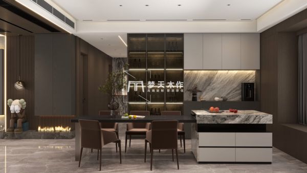 【翁涛】:该方案的业主是一对90后年轻夫妻,非常喜欢现代意式的设计,也十分注重生活品质的体验,他希望室内空间能够呈现深邃神秘质感,以及高级大气感觉,综合以上需求委托了我们给他设计,根据业主的意愿,融入我们的设计理念。整体方案虽以深色为主,但不显压抑。混油灰色墙板搭配深色木饰面增加视觉对比,背景墙的个性设计让空间更有层次感,少量金属的元素运用可以提升空间简奢质感;大理石作为意式的特征元素强化了意式风格,加上无主灯灯光设计和背景、柜体的灯带营造出高级的氛围感;布局规划方面,合理利用空间增加收纳功能,并同时保证空间的流动性,让生活更加舒适。
