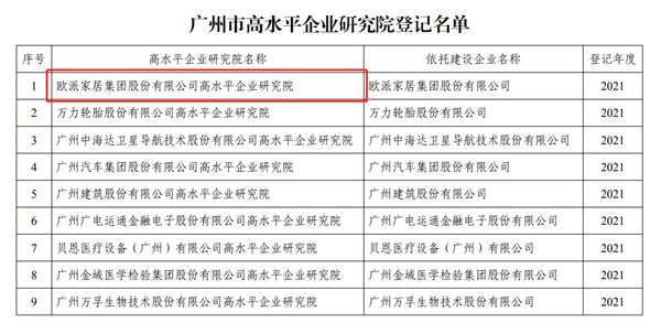 定制快讯|欧派家居获“广州市高水平企业研究院”登记认证