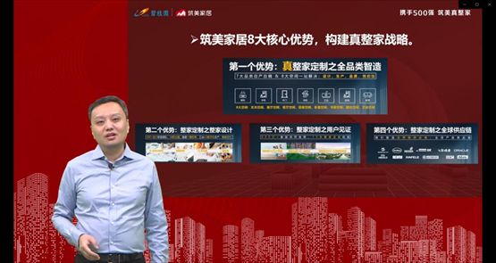 直播会伊始,筑美家居集团零售中心总经理何毅对筑美家居7大品类自产自销、600万用户见证、30000人服务团队、350亿产能等八大战略优势进行了全面解读。