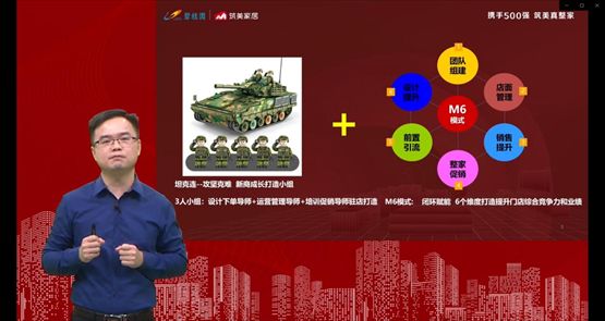在本次财富峰会中,筑美家居零售中心商学院戢仁峰院长详细解读了筑美如何通过坦克连驻店帮扶 + M6运营模式赋能新店,将新经销商扶上马、送一程,建立完善的门店团队和运营体系。