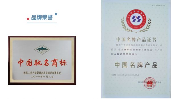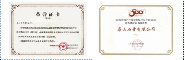 “泰山”牌石膏板先后荣获“中国名牌产品”、“中国著名商标”、“中国最具影响力石膏板品牌”、“人民信赖品牌”、“中华品牌商标博览会金奖”、“全国建筑装饰材料行业质量领先品牌”、“全国质量检验稳定合格产品”、“全国产品和服务质量诚信品牌”、“全国产品和服务质量诚信示范企业”等荣誉称号,产品不仅通过国标检测,同时获得欧盟CE认证,是国内国际双认证产品。