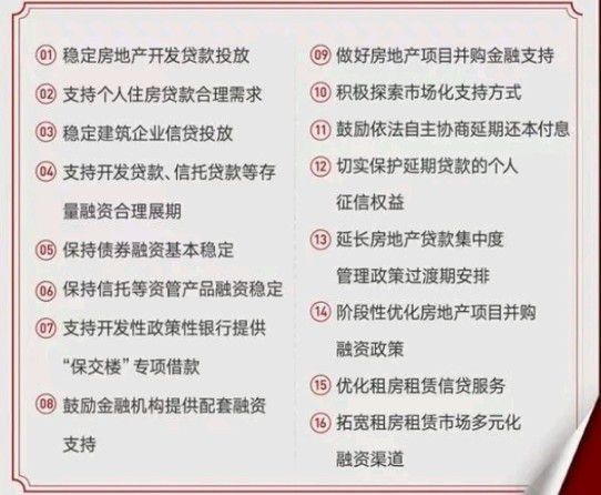 这些内容也被称为“金融十六条”,再加以之前连续性颁布的其他地产利好政策,达到引导房地产市场“软着陆”的目的。