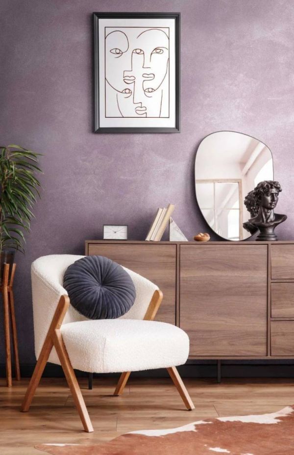 明暗的光斑似有若无停留在墙壁,像午后的丁达尔效应。白色布椅简单干净,木质边柜深邃沉稳,白色布椅点缀出明,木质边柜衬托出暗,摒弃复杂元素,一抹亮色已足够,低调奢华蔓延,交织出生活片段。