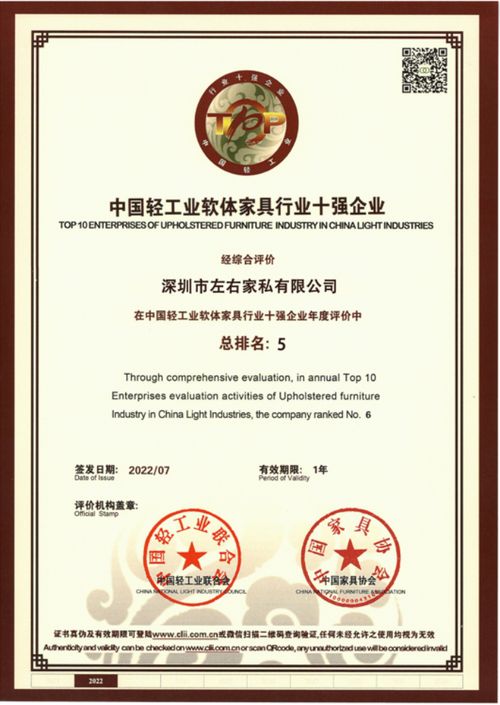 中国轻工业联合会对轻工企业2021年度的营业收入、利润总额、营业收入利润率、税收占利税比重、研发投入及营业收入增速等指标综合评价,最终评选出了2021年度中国轻工业各细分领域优势企业,其中左右家居上榜《中国轻工业软体家具行业十强企业》。