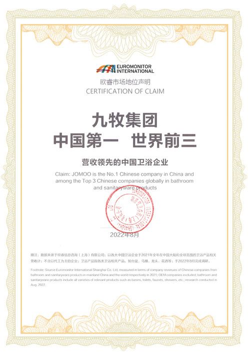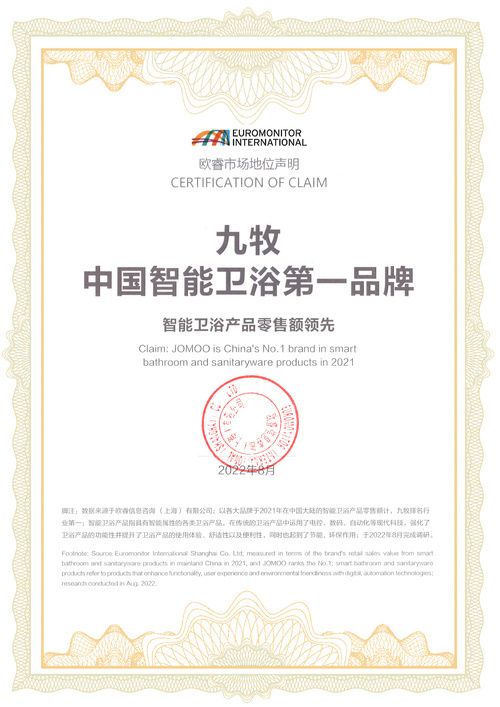 “今年8月,欧睿就中国大陆和全球的卫浴市场以及国内智能卫浴市场开展了一次系统、全面的市场调研工作。欧睿对从每个访谈对象处所获取的信息与观点进行了反复的验证和校对,从而确保最终结论的严谨性,并尽最大可能地排除了主观偏见性,最终得出调研结果。”穆愔表示。据悉,欧睿咨询成立于1972年,是全球领先的市场信息提供商,具有50年历史,在全球设有16个办公室覆盖各个大洲,为全球不同领域的企业客户提供独立的第三方市场调研数据及报告,授予九牧集团的两项权威认证是欧睿咨询经过专业、详细、严谨的调研评定,具有很强的信服力和公信度。