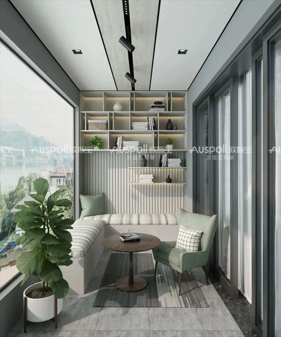 为了达到节省和创造灵活空间的目的,可以将书房与阳台结合一体,视觉上也增加客厅使用面积,人性化规划家庭空间。这样就可以拥有一方独立安静的办公区!