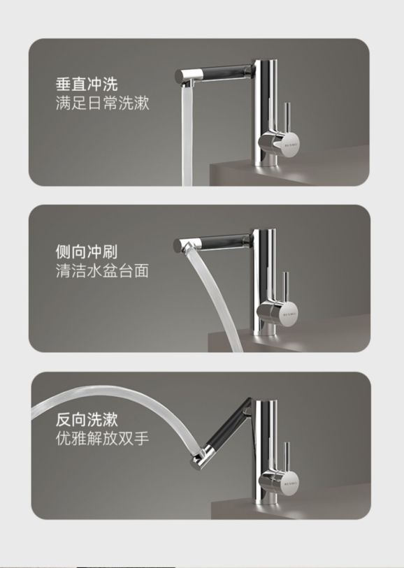 作为新一代净水护肤龙头,万向过滤龙头在360度自由出水设计中,提升柔发、护肤功效,带来多样洗漱方式,有效解决多种日常洗漱问题。