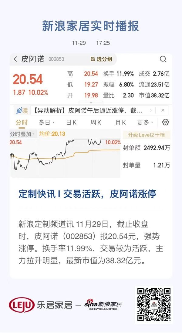 新浪定制频道讯 11月29日,截止收盘时,皮阿诺(002853)报20.54元,强势涨停。换手率11.99%,交易较为活跃,主力拉升明显,最新市值为38.32亿元。