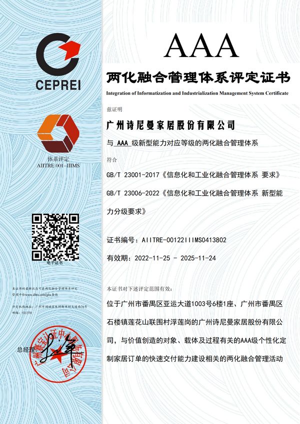 近日,诗尼曼以CRM、MES及分享家为核心的信息化平台,荣获2022年“两化融合贯标体系”AAA认证。