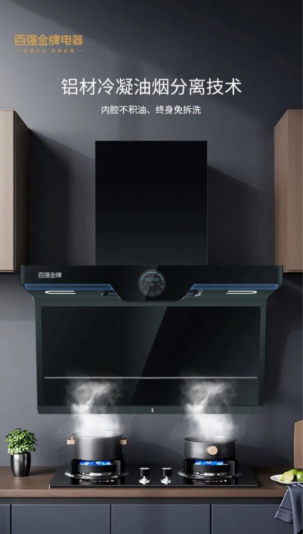 百强金牌智能油烟机,纯铜塑封电机,质量可靠,性能稳定,澎湃超强动力,开机即可油烟暴走,大风压设计,排烟更顺畅。集约设计不占地儿,省空间同时助力清洁厨房,让烹饪变得更加清新洁净。