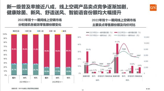 与此同时,虽然整体均价下滑,但线上空调市场并未陷入低价竞争的陷阱,空调产品结构快速提升,新一级、舒适送风、新风空调占比继续提升。据GfK中怡康线上周度监测数据显示,2022“双11”期间,新一级空调的额份额达到80.0%,相比去年同期增长9.0个百分点;舒适送风功能空调额份额达到5.6%,相比去年同期增长4.0个百分点;新风空调占挂机的额份额达到2.2个百分点,相比去年同期增长了0.2个百分点。