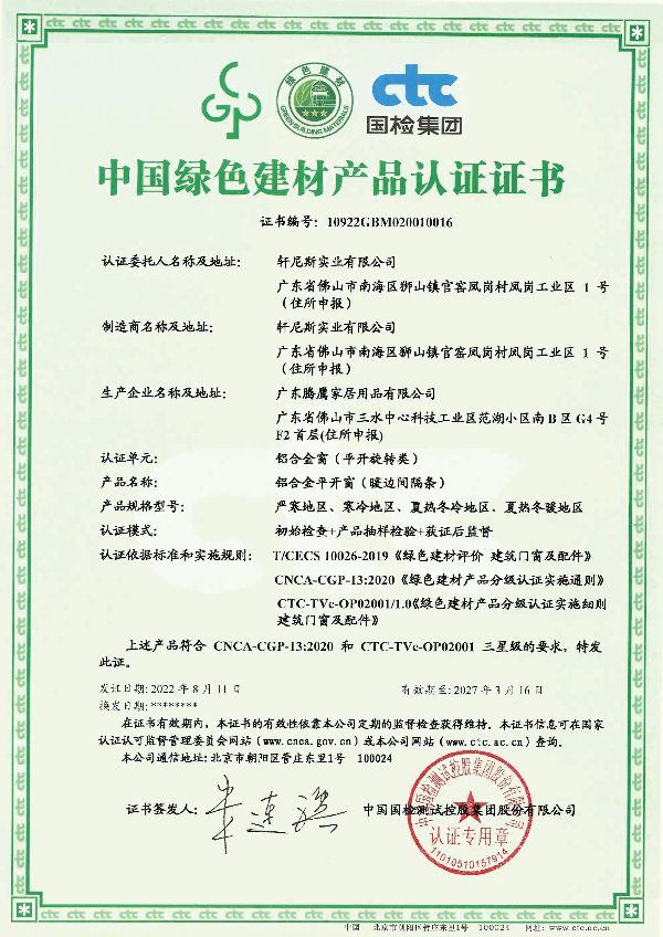 作为门窗行业绿色环保标杆企业,轩尼斯门窗18年来始终致力于为中国家庭提供更舒适的生活环境而不懈努力,并在2022年荣获“中国绿色建材产品认证证书”,使每一扇门窗都被赋予为绿色健康家居生活创造最大价值的使命。