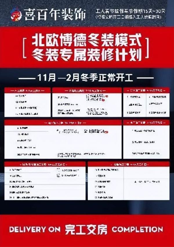 除了省钱,喜百年“冬季价格保卫战”给业主带来的另一个好处就是,在冬季预定装修,其装修效果比其他时间更好。冬季本不是一个特别适宜装修的时间点,但很多楼盘都会选择年底完工交房,业主好不容易等来了交房,可遇到冬季还不能将装修提上日程。加上现在买房的年轻人居多,既要还房贷,又要交房租,压力很大,想要早点入住,所以着急装修的不在少数。为此喜百年12月2日举办的“材料底价保价签约仪式”全新发布了《北欧博德冬装模式》,针对冬季装修的不足和贵州的气候特点,引进全新的冬季装修材料和冬装工艺,并根据工人施工节点进行合理化安排,制定详细的冬季装修计划表,对每个装修节点精准把控,让冬季家装施工可最大程度保证完美效果的呈现。在冬季选择喜百年定装修,快人一步住新家。