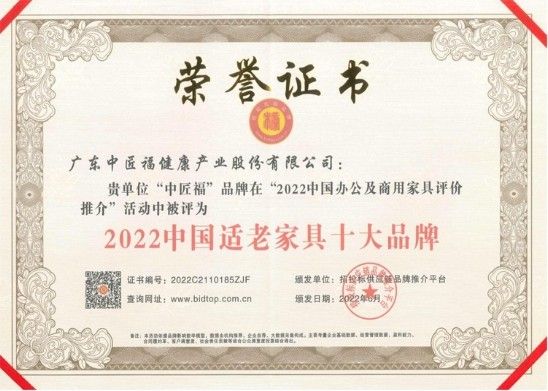 18年致力于研发、生产、销售、服务一体的适老化产品整体配套服务,是国内屈指可数的适老化全产业链综合服务型的高新技术企业。产业已经覆盖了适老化家具、适老化产品、适老化改造、养老运营服务等领域,通过整合各产业链的资源优势,提供战略咨询、整体策划运营、适老化设计、养老产品供应等闭环式养考产业综合服务,并得到了业内的广泛好评。目前已通过ISO9001、OHSA18001认证、十环认证等,荣获超过200多份权威证书,并在招投标供应链品牌推介平台举办的“2022中国办公及商用家具评价推介”活动中,连续6年荣获“中国适老家具十大品牌”称号。