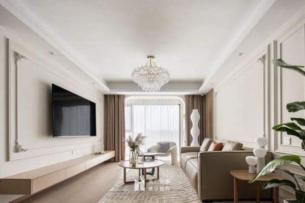 客厅拆除了原有的墙纸,运用雕花石膏线勾勒出简约的几何线条,并选用精致水晶灯,营造出浪漫精致的氛围。