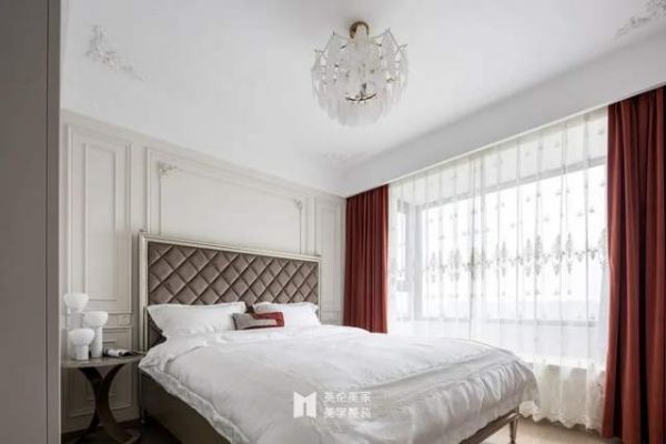 卧室延续客厅的主调,红丝绒的窗帘,咖色的床头,奶油白的墙壁,石膏板的框线装饰,艺术气息与生活实用性兼备,高级中透露着给予生活的柔软。