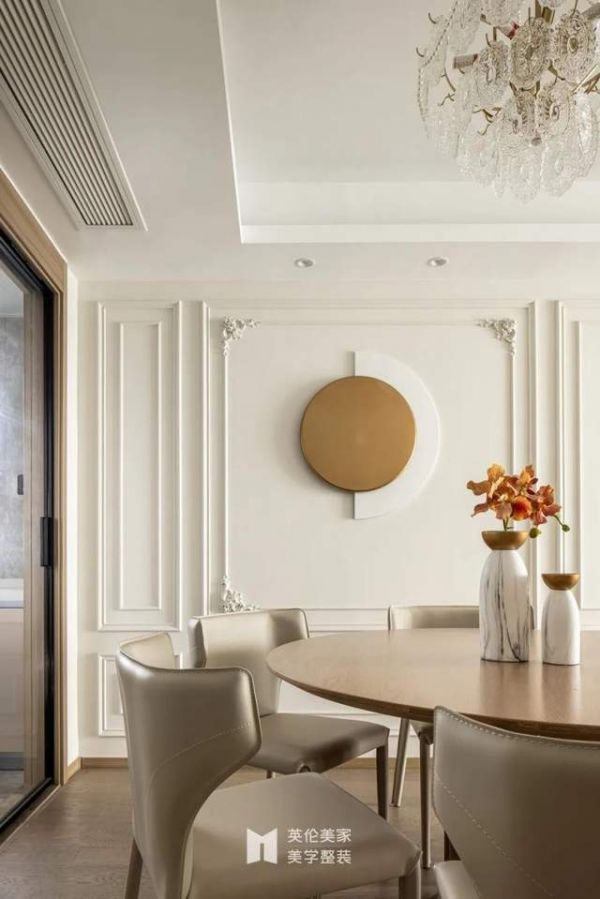 木制圆桌与皮质椅的质感与背景墙营造浓浓的法式情调,悠悠岁月在这里与家人共享每一餐的惊喜,是光阴赐予最浪漫的礼物。