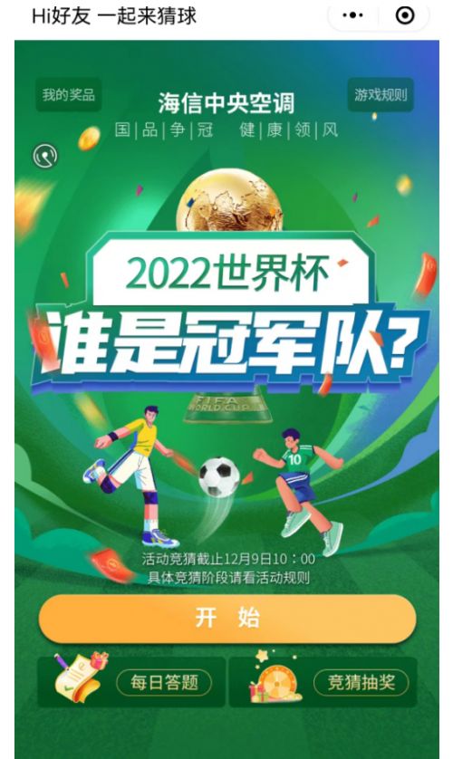 新国品陪你Hi聚世界杯,竞猜赢大奖!作为2022卡塔尔世界杯官方指定中央空调,海信中央空调除了将以健康风守护绿茵球场内的运动员们、赛场外观球的国人,更于近日上线猜球小程序,邀请人们边看边猜,一起点燃热爱与激情,为心目中的王者战队摇旗呐喊!