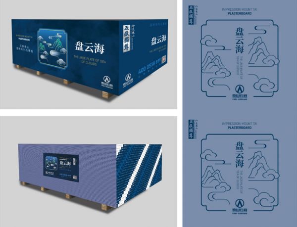 《盘云海》形象包装主视觉采用海洋蓝,云海蓝,描摹了自然的神奇浩瀚与文化文明的璀璨,以泰山之景为“形”,以泰山文化为“神”,打造形神俱佳的高端产品。在运用过程中,将以大大优于普通纸面石膏板的卓越性能指标,成为众多经销商、装饰企业和业主的首选产品,快速跻身为石膏板市场的主流。