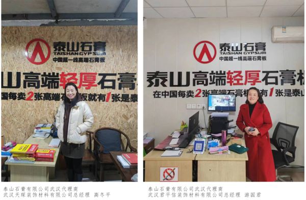 泰山石膏有限公司武汉代理商武汉天琛装饰材料有限公司总经理高冬平表示,泰山金砖9项全能高端石膏板是一款高品质、多功能的石膏板,在泰山石膏的支持下该公司不断发展壮大,未来对“印象泰山”系列产品充满了信心,也将为更多的高端工程和高端家装提供更高端的服务。武汉君平信装饰材料有限公司总经理游国君表示,“印象泰山”系列——盘云海石膏板的出现为公司开辟了新的赛道,今后必将加大对其推广力度,携手泰山石膏继续秉承“质量服务重于泰山”的企业价值观,助力更多精品工程和高端家装的打造。
