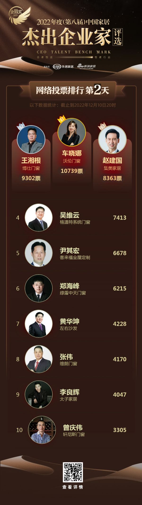排名四至十位的是:格温特系统门窗吴维云(7413票)、客来福全屋定制尹其宏(6678票)、绿盾中天郑海峰(6215票)、左右沙发黄华坤(4228票)、维朗门窗张伟(4170票)、太子门窗李良辉(4047票)、轩尼斯门窗曾庆伟(3305票)。