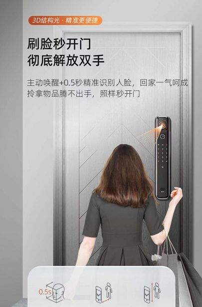 好太太V86MAX智能锁采用的是3D结构光人脸解锁技术,在0.4-0.8米识别距离与1.2-2.2米识别高度内,只需0.5秒,瞬间开锁,正所谓“越智能,越简单”。对于双手提物的回家人极度友好,无需弯腰放取物件,一步进门,省时省力,让回家也变得百分优雅。