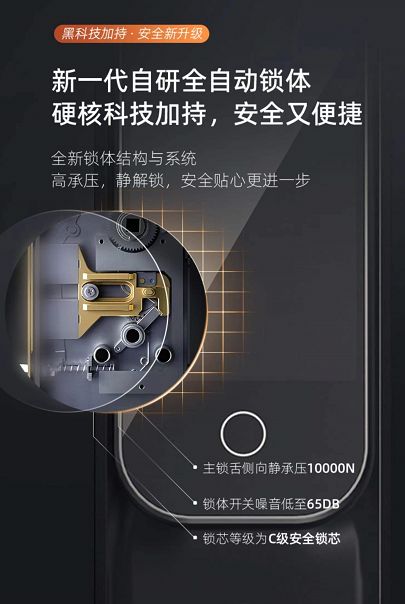 软件科技做足,硬件设备用足,V86MAX智能锁为安全上了双保险,除了3D结构光人脸解锁技术,还使用了新一代自研全自动锁体,全新锁体结构与系统,高承压,静解锁,化安全于无声关爱中。