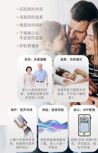 V86MAX智能锁的柔性科技特点不只体现在智能警告上,更体现在日常关怀细节上,深夜回家静音开门、变声对讲、家人未及时回家的关爱消息推送等,无不体现着别样铁将军的柔情与温馨。