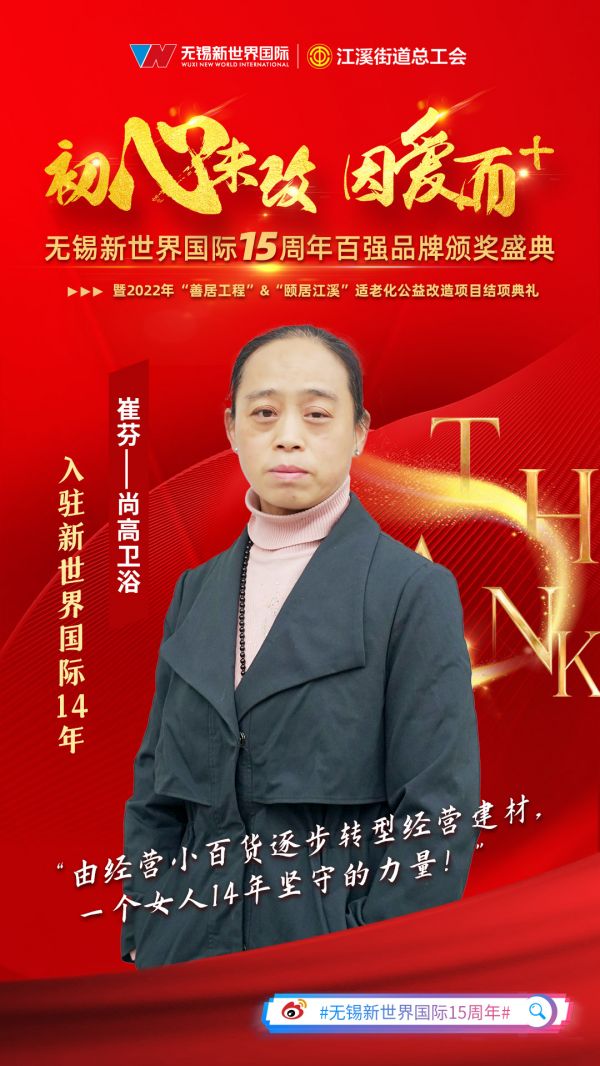 无锡新世界国际的发展离不开一群特别的人,他们与无锡新世界国际共行十余载,他们是无锡新世界国际发展的亲历者和见证者,在他们的身上,有岁月沉淀的厚重,亦有曾经沧海的淡然;有对生活的无限热爱,也有对事业的从容笃行;曾遭遇过危机,也享受过荣耀。在无锡新世界国际15周年之际,我们特别推出《新世界国际十五周年·商户说》访谈栏目,带大家走进他们的故事。第八期我们采访到无锡新世界国际商户崔芬(尚高卫浴老板),首先跟随着小编简单了解下商户崔芬(尚高卫浴老板):崔芬,无锡新世界国际A24-10-11-12-13-14商铺经营户,2009年4月来到新世界,今年是她在新世界开店的第14年。现在,她独自打理着一家200㎡的建材品牌店,主要经营品牌卫浴产品。她时常打趣着说:“我几乎小半辈子的时间都在新世界了,新世界就是我的家,不管怎么样,我都不会离开新世界”。就是这样一个积极乐观的女人用14年的坚守,为自己和家庭撑出了一个希望的未来!接下来,让我们通过本期的访谈,深入了解一下无锡新世界国际商户·崔芬的故事。