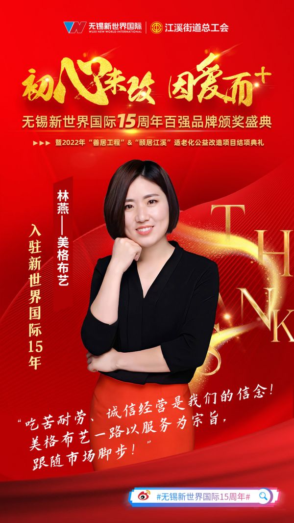 【活动预告】值此年终之际,为表彰和鼓励先进,提高市场活力!12月13日下午2:00,无锡新世界国际15周年百强品牌颁奖盛典暨2022年“善居工程”&“颐居江溪”适老化公益改造项目结项典礼将在无锡新世界国际家居建材城二期·精品建材馆一楼举办,诚挚的邀请您参加~期待您的关注和莅临,新浪江苏•无锡将持续报道后续访谈内容及颁奖盛况。