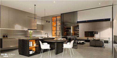 在国际范的现代感背后,科勒厨房,全屋定制至臻系列将流畅动线和通透格局相交织。吊趟式的三连动玻璃隔断门让空间穿透性更强、环境更酷,同时避免了地轨藏污纳垢。