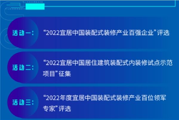 为促进我国装配式装修行业高质量、可持续发展,提升装配式装修企业的核心竞争力和品牌影响力,鼓励装配式企业创新奋进,加强装配式装修行业之间的交流与合作,中国建材工业经济研究会装配式建筑和绿色发展分会联合相关机构、协会、企业等,在相关部门指导下启动了“2022宜居中国装配式装修产业年度榜单”征集评选活动,包括了“2022宜居中国装配式装修产业百强企业”、“2022宜居中国居住建筑装配式内装修试点示范项目”、“2022年度宜居中国装配式装修产业百位领军专家”三大榜单及20+个子榜单。