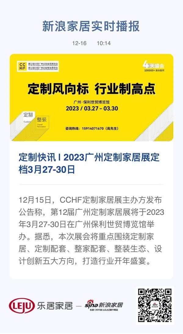 新浪定制频道讯 12月15日,CCHF定制家居展主办方发布公告称,第12届广州定制家居展将于2023年3月27-30日在广州保利世贸博览馆举办。据悉,本次展会将重点围绕定制家居、定制配套、整家配套、整装生态、设计创新五大方向,打造行业开年盛宴。